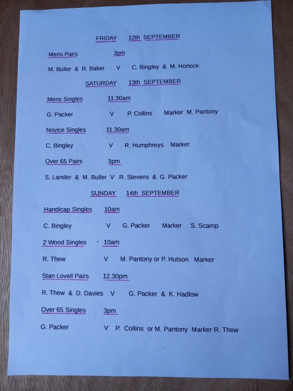 Finals Schedule Fri 12th, Sat 13th, Sun 14th Sept